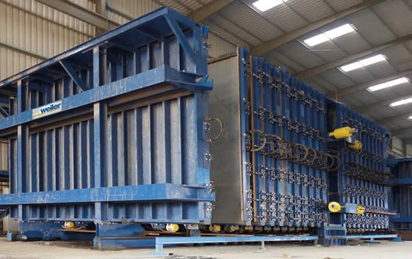 • تم دفع الحجيرات معًا، وإغلاقها قبل التعبئة بالخرسانة. لم يتم قفلها، ولكن تم سحبها بشكل منفرد لإزالة الهيكل المؤقت والألواح الجدارية.