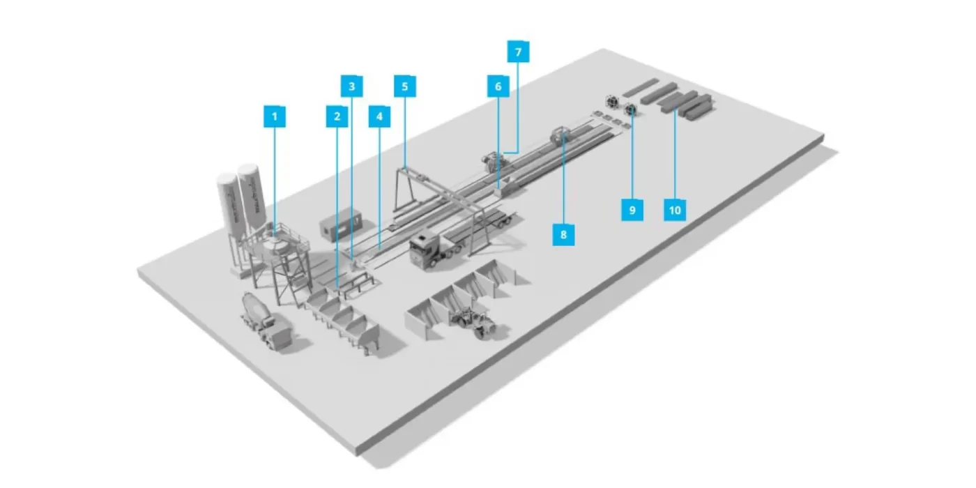 mobile modular, scalable precast concrete plant offers entirely new possibilities for the production of high-quality precast concrete parts on site. The advantages in quote calculation for large projects will also be attractive. A mobile plant enables you in offering high-quality precast concrete parts at best flexibility with minimum transport costs. The location-independence of the facility gives you a clear competitive advantage in project tenders; with on-site production even eliminating the need to invest in a suitable plot of land.