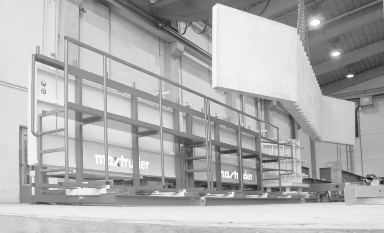 Individual precast concrete stairs. Formwork with manual or hydraulic adjustment for the production of stairs with smooth steps and soffit. Due to the fast and precise installation of landings at any step and the horizontally movable and height-adjustable back wall, all common stairs can be produced in one formwork.