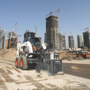 Powered by the carrier’s high-flow hydraulics, the wheel saw cuts through asphalt, concrete, and other materials to produce a trench for installing utility lines. The trench cleaner (available with 6 in. and 8 in. wheels only), which is raised and lowered hydraulically, assures a clean trench for installation. Use the hydraulic depth adjustment gauge to deliver a consistent, uniform cut depth. For operating close to curbs and walls, the hydraulic side-shift allows the attachment to shift flush with any nearby object for a close cut.